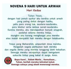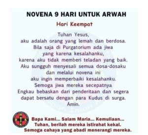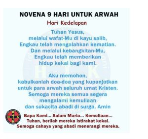 Mereka semua adalah putra-putri-Mu yang kami kasihi, para orang tua, kerabat, teman, saudara kami, mereka yang telah berjasa kepada kami selama hidupnya, dan tak lupa juga bagi sesama yang telah menyakiti kami, yang sangat membutuhkan pengampunan kami. Ya Allah, kami persembahkan doa Novena arwah hari …ini, untuk menebus segala dosa yang telah mereka perbuat dan mohon terimalah mereka dalam persekutuan surgawi. Demi Yesus Kristus Putera- Mu, Tuhan dan pengantara kami, kini dan selama-lamanya, Amin